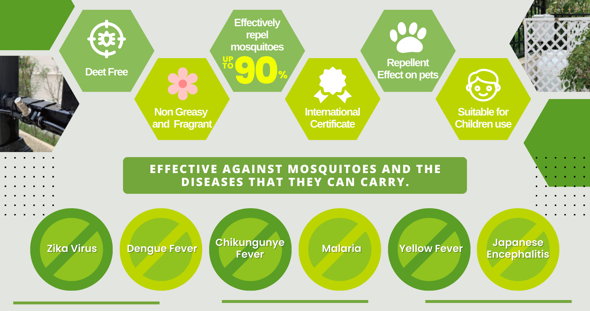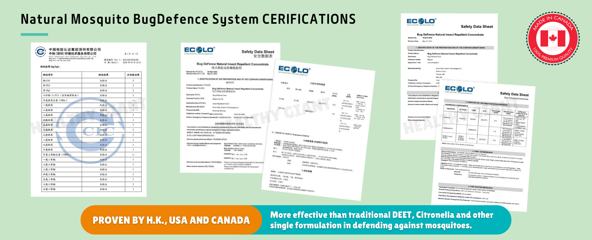 驅蚊屏障系統的核心為專利註冊的 BugDefence™ 純天然蚊蟲驅趕劑,其配方以「香葉醇」為主,經由多種純天然精油組合提煉而成。當中包括: