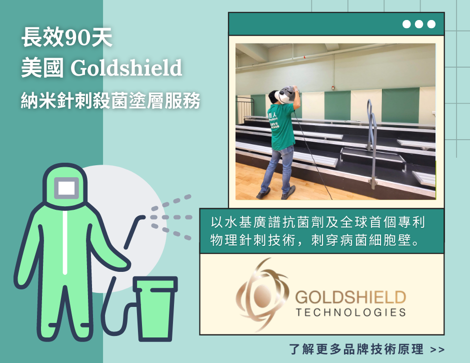 Goldshield® 是全球頂尖的消毒塗層技術之一,樂巨人為其香港授權服務供應商。Goldshield® 由美國製造,其抗菌消毒原液採用了專利納米技術及物理性尖端科技,通過獨特的「刺解」方式,能持續殺滅 99.99% 的細菌和病毒,包括 新冠病毒 (COVID-19)、甲乙型流感病毒 (H5N1, H1N1) 和 大腸桿菌 等超過 100 種有害物質。這項技術經美國環境保護署 (EPA)、食品藥品管理局 (FDA) 等多個權威機構認證,具有極高的安全性和效能。