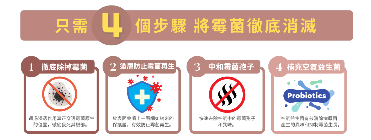 獨家專利配方,徹底分解霉菌根部,同時抑制孢子和毒素。