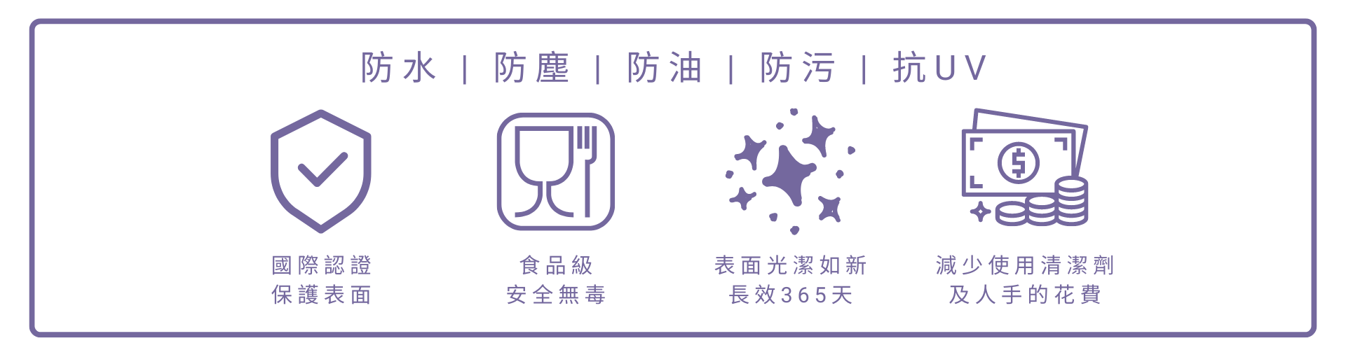 使用Nanotol完整保護除了水晶般的品質外觀,完整隔離環境因素造成的老化與清潔造成的物理性損傷。