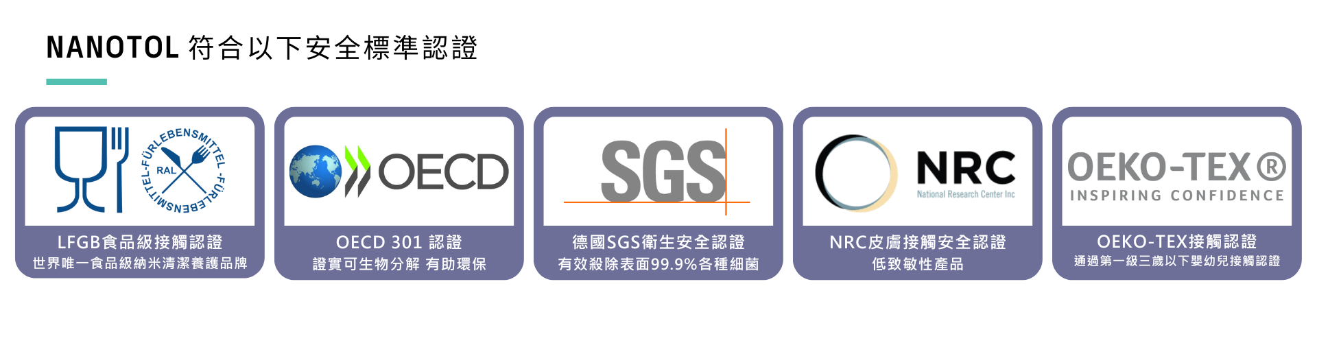Nanotol 的卓越性能與環保理念已獲得多項國際權威機構的認證,充分證明其對環境、人體及物品的零污染特性: