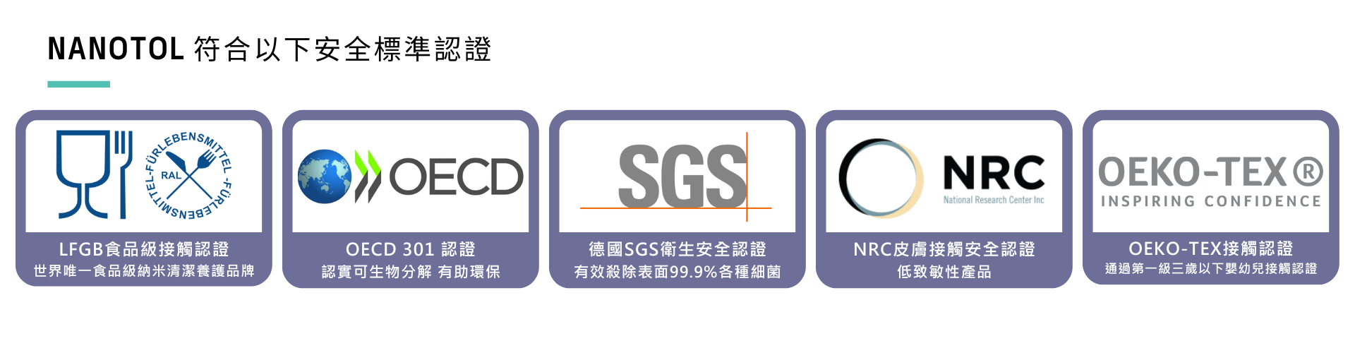 Nanotol實驗證實是完全可生物分解的,對人體、動物、環境零傷害,並通過以下認證 :