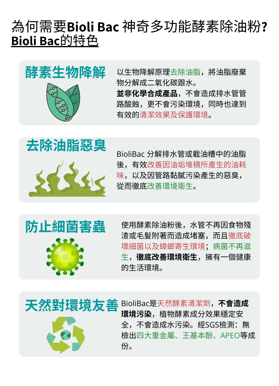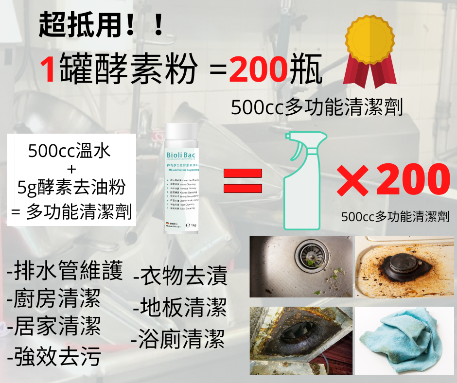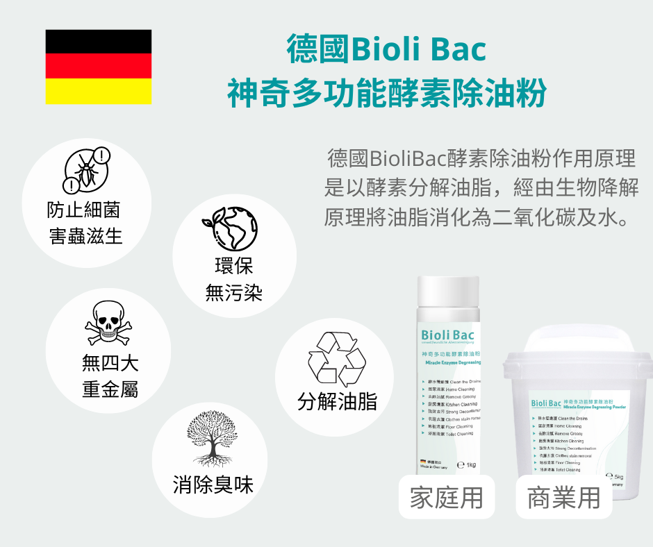 Q: Bioli Bac 德國神奇多功能酵素除油粉的原理?