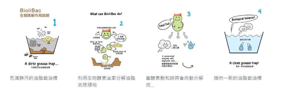 例如餐廳裏的廚房隔油池,酵素粉可以食曬隔油池的浮渣和油脂,去除頑垢,當酵素飽和時,將會分解成二氧化碳(CO2)和水(H2O),達至煥然一新的油脂截油槽。