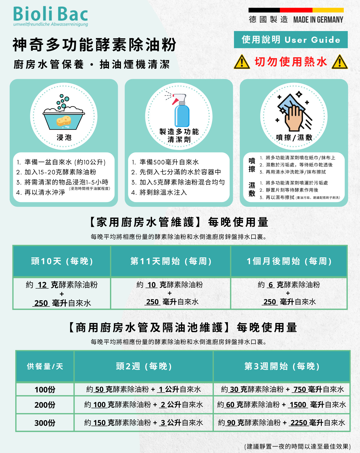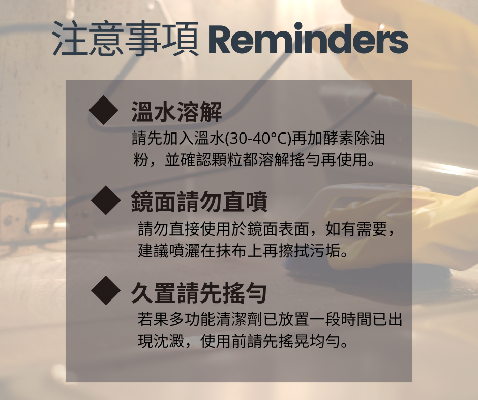 - 強效去污 | - 衣服去漬 | - 地板清潔 | - 浴廁清潔使用方式 : 建議靜置一夜的時間以達至最佳效果。因為酵素除油粉需要時間去喚醒活性,所以可以在每晚最後使用完水槽後倒入5g酵素除油粉 + 250cc溫水(30-40°C)進行清潔,並靜置過夜。 ⚠️ 切勿使用熱水 ⚠️