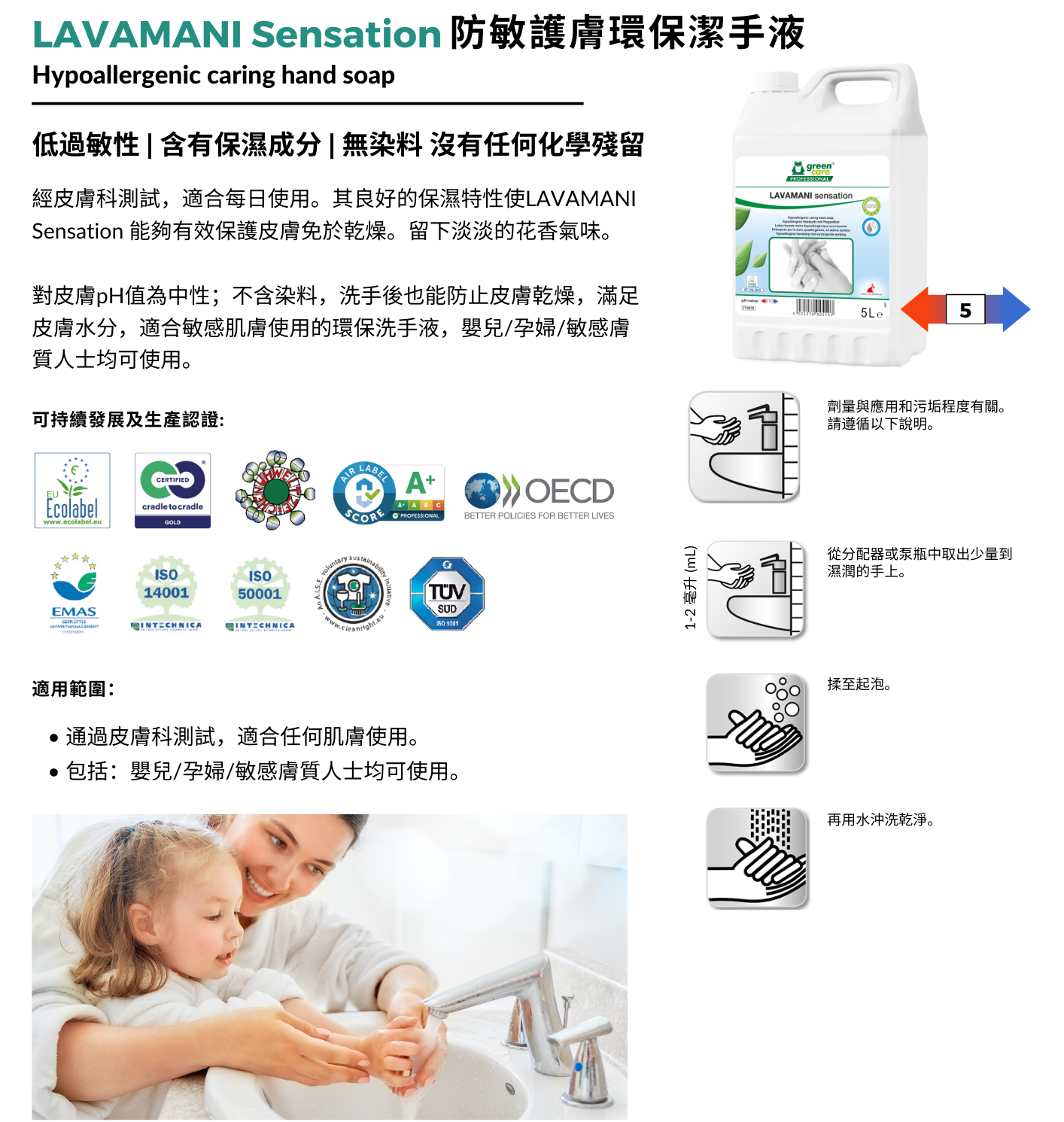 ■ LAVAMANI Sensation適合頻繁使用,即使在洗手後,仍可以防止皮膚乾燥,並保護皮膚水份。