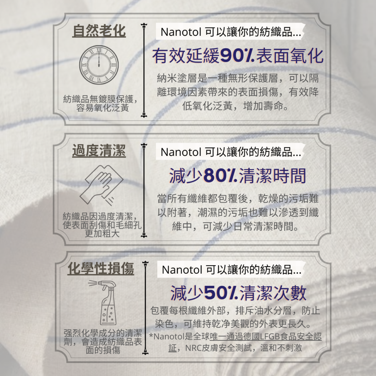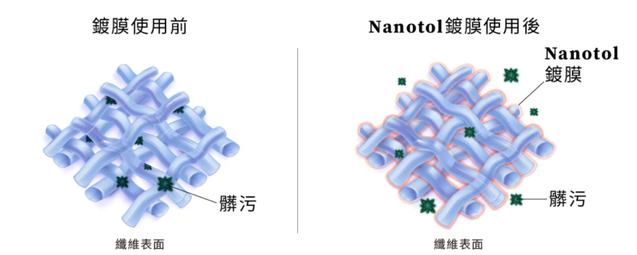 Nanotol使用納米結構包覆每根纖維,與傳統的防水噴霧不同,防水,防塵等效果更爲持久,而實測超過2年仍然有防護 功效.即使清洗超過十次後仍有防污的效果。