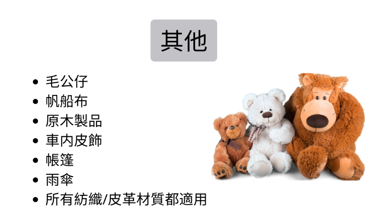 由於Nanotol Protector (Textile)僅適合於紡織品/皮革等吸水材質,而塑膠或金屬則屬於非吸水材質,若有需要,可另購Nanotol Protector (non-absorbent)的納米塗層,以防止氧化。