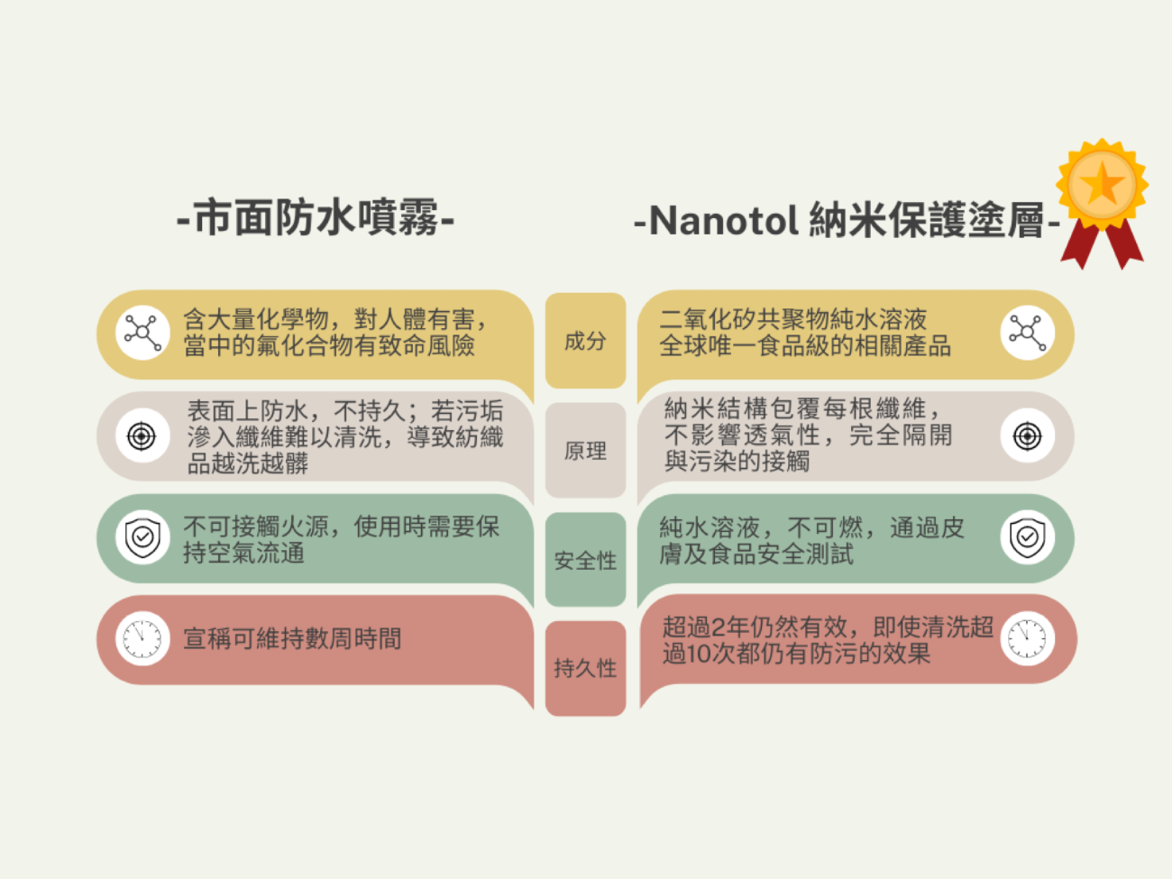 Nanotol 產品是全球唯一食品安全等級的相關產品,與市面上其他的防水噴霧不同,沒有刺激味道。而且Nanotol通過多次認證不含化學有機溶劑,不含氟碳化合物,不含化學樹脂,不含對人體有害的單一奈米顆粒,確保不傷害人體和環境安全。