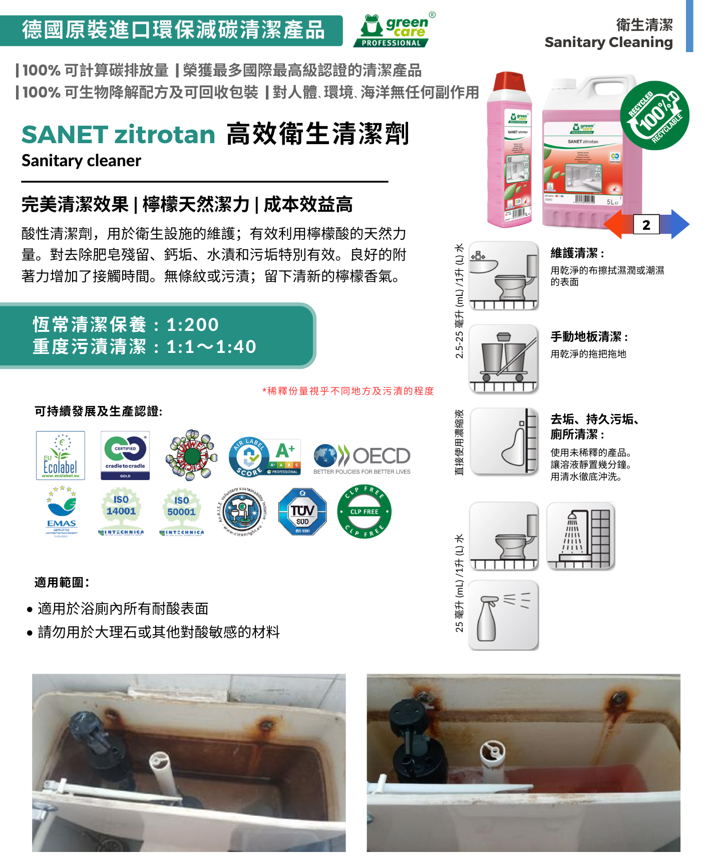■ SANET zitrotan 是弱酸性的浴廁清潔劑,有效成份為天然檸檬酸,可自然分解,成份安全,保障使用者及員工健康