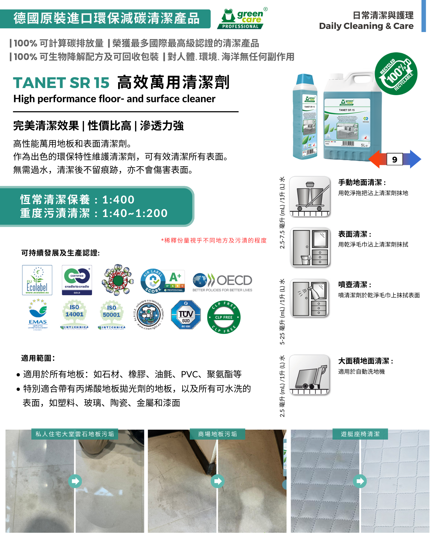 ■ TANET SR 15 是擁有獨特環保配方的強效表面護理清潔劑