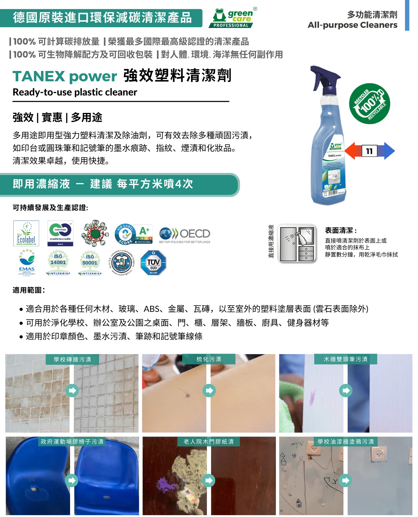 ■ TANEX power 是即用裝的塑料清潔及除油劑,適用於去除所有頑固污漬。