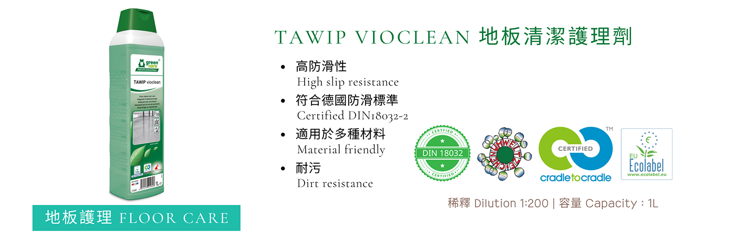 ■ TAWIP vioclean 是一種具強效護理效果和卓越環保特性的地板清潔劑。成份安全,保障使用者及員工健康。