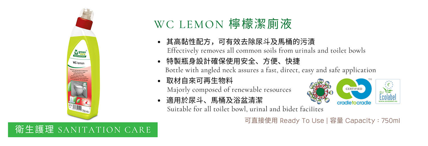 ■ WC lemon 弱酸性潔廁液,有效成份為天然檸檬酸,可自然分解,份安全,保障使用者及員工健康